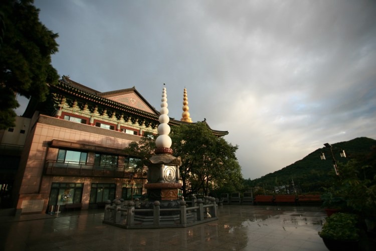 The Seven Treasure Pagoda is on the roof of the Seon Center, and is made of seven golden spheres. Easily seen from far away, the Seven Treasure Pagoda looks even more beautiful at night when it is illuminated with light.